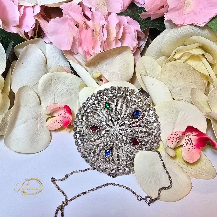 Prelepa srebrna ogrlica sa priveskom, vintake komad ručno rađen sa kristalima, veličina priveska je 8,3 cm.