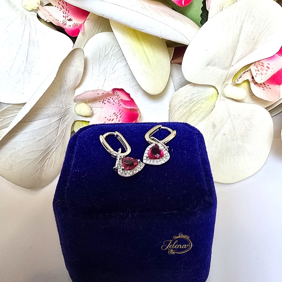 Predivne srebrne minđuše sa crvenim kristalima u obliku srca oko kojih su cirkoni.