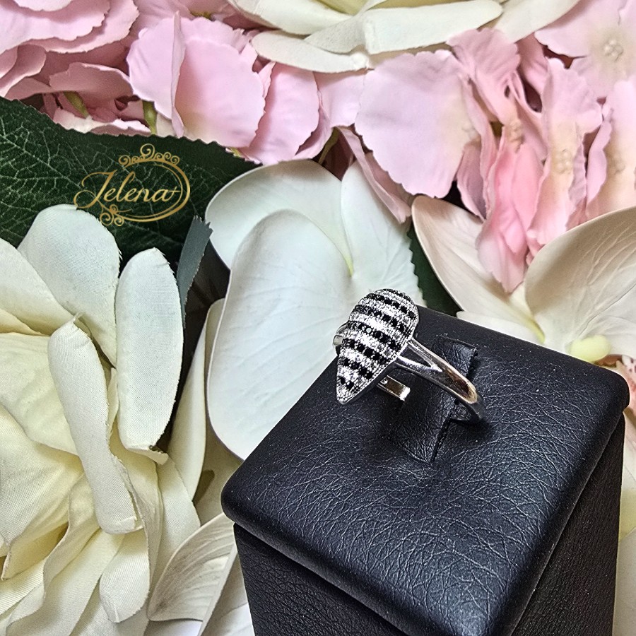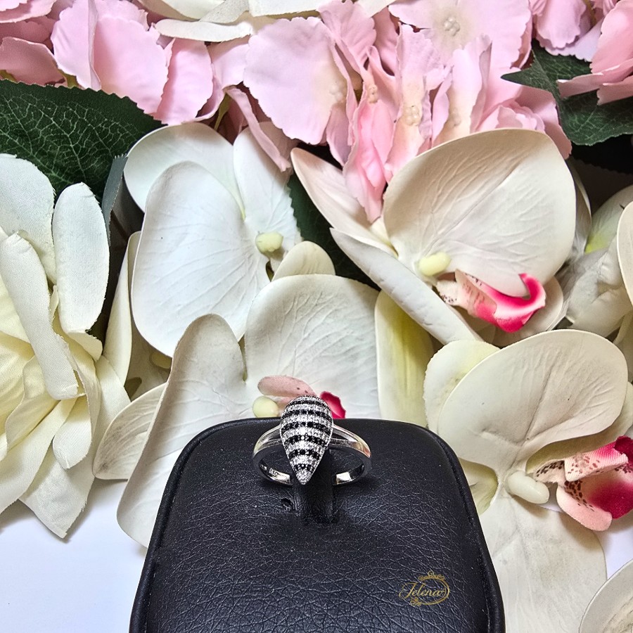 Interesantan dizajn srebrnog prstena sa cirkonima i tamnim kristalima.