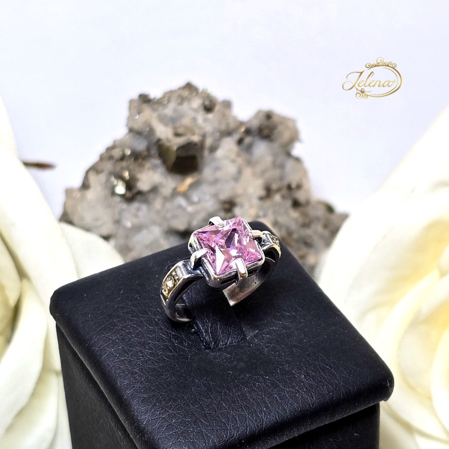 Elegantan srebrni prsten sa roze kristalom i cirkonima na obruču.